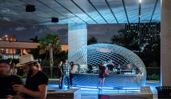 MX3D, in collaboration with Miami-based Berenblum Busch Architects (BBA), created Cucuyo, a sculptural outdoor bar for the Perez Art Museum Miami (PAMM). Installed on the museum terrace overlooking Biscayne Bay, the stainless-steel café combines innovative 3D printing technology with functional design, opening to the public on September 27, 2017.