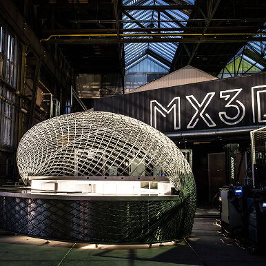 Constructed using MX3D’s industrial robot equipped with an advanced welding machine, the café’s open shell exterior features intricate, thin crossbeams that encase the interior while allowing breezes from Biscayne Bay to pass through. Weighing 700 pounds, Cucuyo is the first large-scale architectural application of MX3D’s 3D printing technology, demonstrating that the design freedoms used in small-scale 3D printing can be applied at an architectural scale.