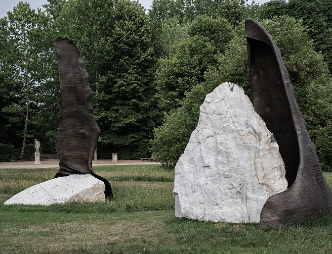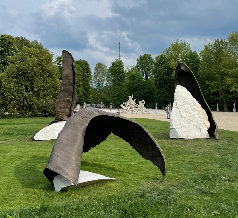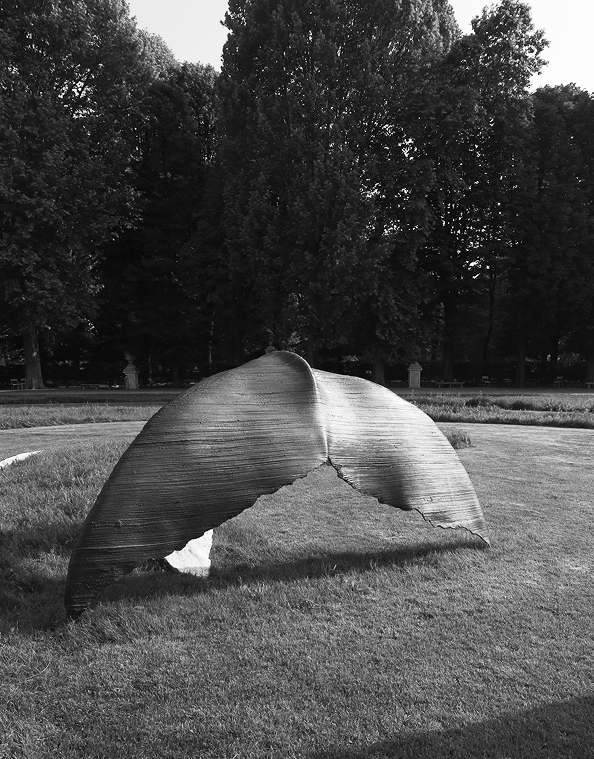 “The humpback whales we encountered in Tonga while diving were lost in the depths of the sea, their dark backs resembling a metal, burnished stainless steel or a liver-patinated bronze. Movements, sinuous twists, made one perceive the white belly streaked with black. The impression was that of the softness of a modelled marble. The work develops following a deconstructive declination.”